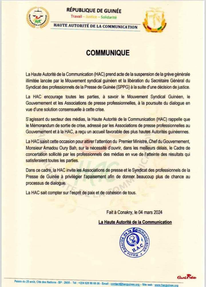La Haute Autorité de la Communication (HAC) prend acte de la suspension de la grève générale illimitée lancée par le Mouvement syndical guinéen et la libération du Secrétaire Général du