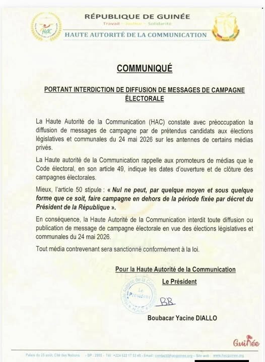 La Haute Autorité de la Communication (HAC) a publié un communiqué interdisant la diffusion de messages de campagne électorale pour les élections législatives et communales du 24 mai 2026 sur les antennes de certains médias privés.
