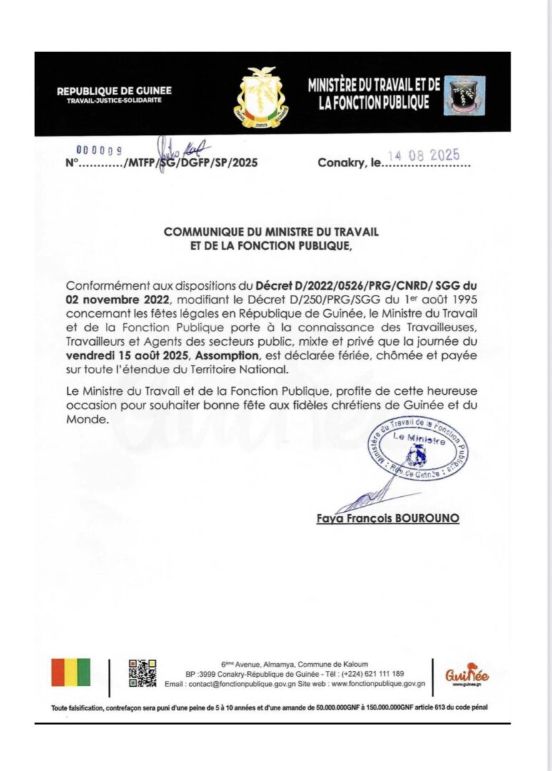 Guinée : La journée du vendredi 15 août 2025 déclarée fériée, chômée et payée (Communiqué du MTFP)