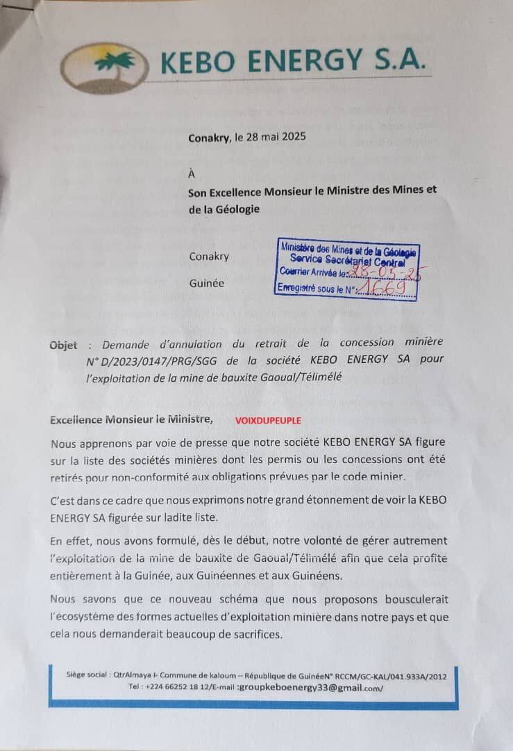 Dans un courrier en date de ce mercredi 28 mai 2025, adressé au ministre des Mines et de la Géologie, la société Kebo Energy S.A demande l’annulation du retrait de sa concession.