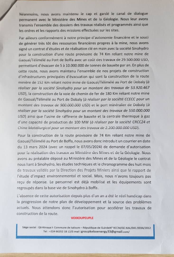 Dans ce courrier de trois pages, la société Kebo Energy S.A exprime son étonnement de se retrouver sur la liste des sociétés minières pour non-conformité aux obligations prévues par le code minier guinéen.