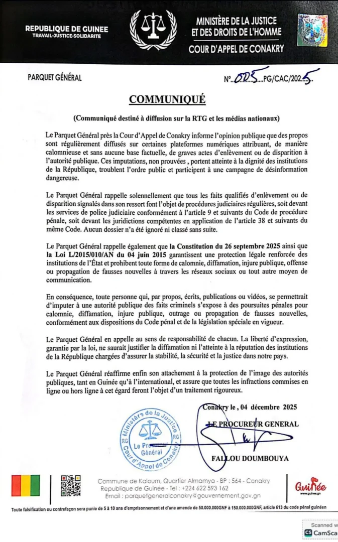 Le Procureur Général du Parquet de la Cour d’appel de Conakry, Fallou Doumbouya a dans un communiqué rendu public ce jeudi 4 décembre annoncé que : « Toute personne qui, par propos, écrits, publications ou vidéos, se permettrait d’imputer à une autorité publique des faits criminels, s’expose à des poursuites pénales pour calomnie, diffamation, injure publique, outrage ou propagation de fausses nouvelles, conformément aux dispositions du Code pénal et de la législation spéciale en vigueur », a-t-il alerté.