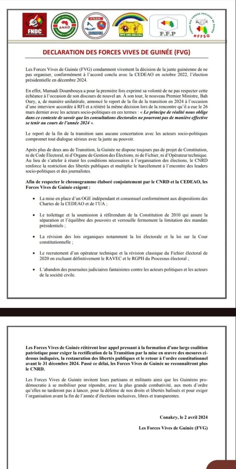 Guinée : Les FVG ‘’dénoncent, exigent, et sollicitent’’ pour la ‘’rectification’’ de la Transition (Déclaration) !!!
