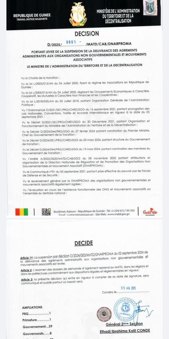 Guinée : Levée de la suspension de la délivrance des Agréments Administratifs des ONGs et Mouvements Associatifs (Communiqué MATD)