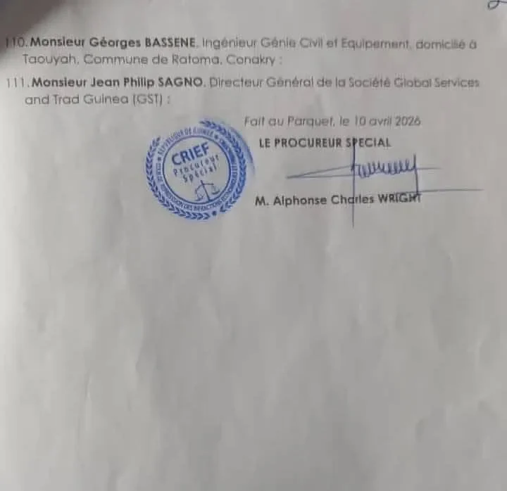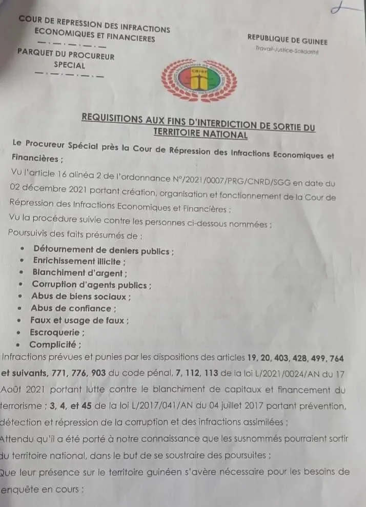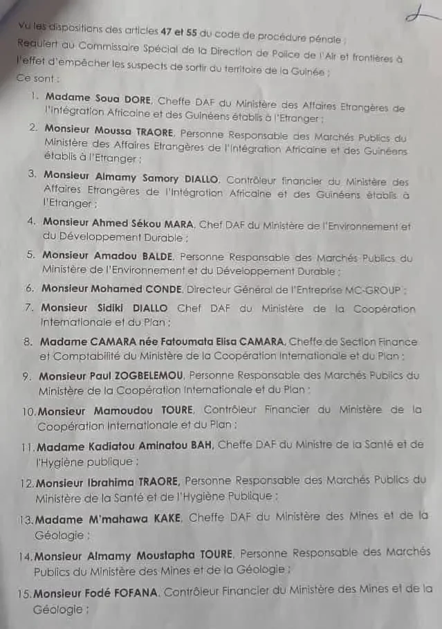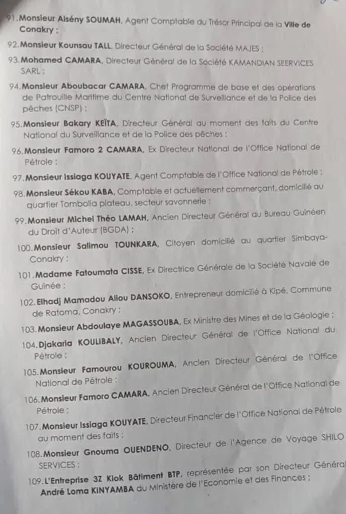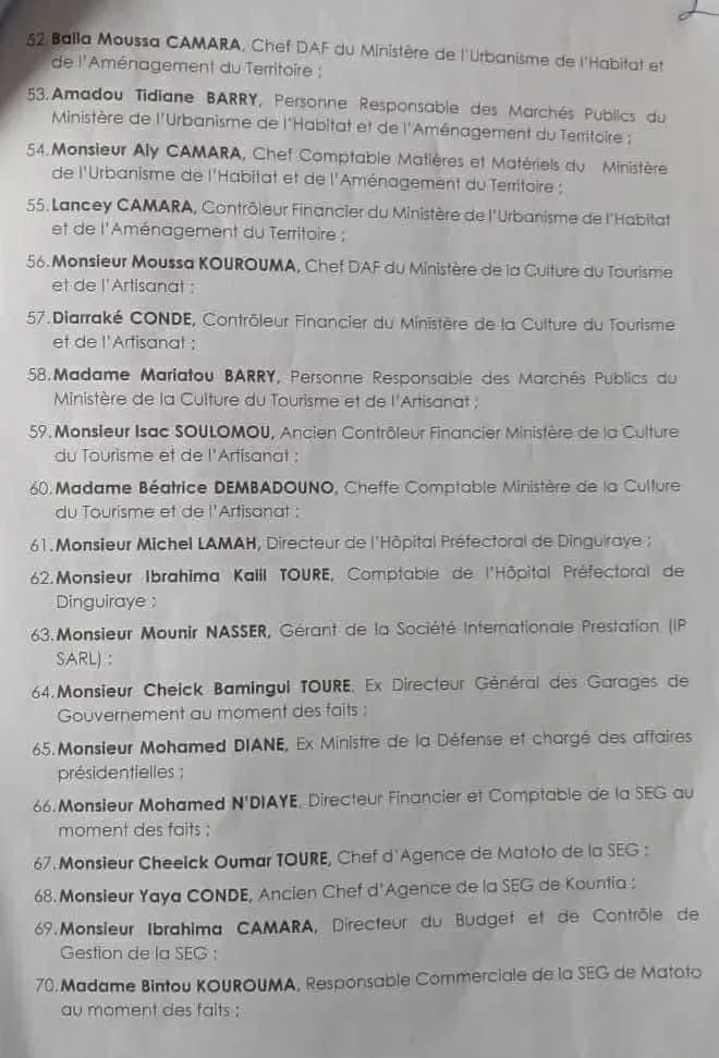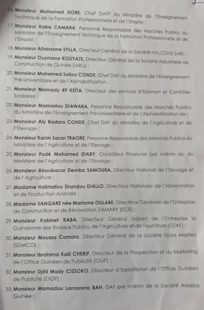 Selon le document il s’agit notamment de directeurs administratifs et financiers (DAAF), de responsables de marchés publics, de contrôleurs financiers, de directeurs, ainsi que de chefs d’agences des sociétés publiques EDG et SEG. L’ancien ministre de la Défense nationale sous Alpha Condé, Mohamed Diané, figure également parmi les personnes visées.