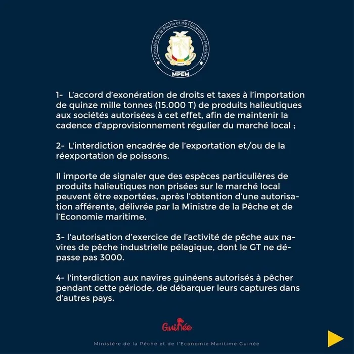 A cette occasion, tous les opérateurs publics, mixtes et privés du secteur de la pêche de la fermeture à compter du 1er juillet 2024 à 00H TU jusqu’au 31 août 2024 à 00H TU, des activités de pêche industrielle et semi-industrielle demérsale dans la zone maritime sous juridiction de la République de Guinée.