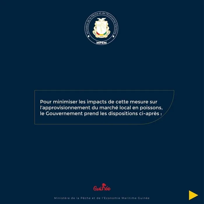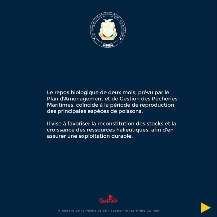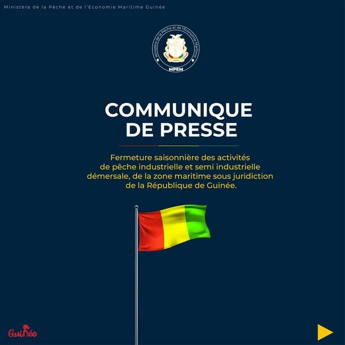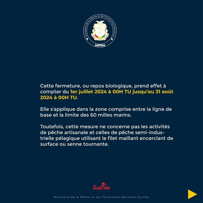 A cette occasion, tous les opérateurs publics, mixtes et privés du secteur de la pêche de la fermeture à compter du 1er juillet 2024 à 00H TU jusqu’au 31 août 2024 à 00H TU, des activités de pêche industrielle et semi-industrielle demérsale dans la zone maritime sous juridiction de la République de Guinée.