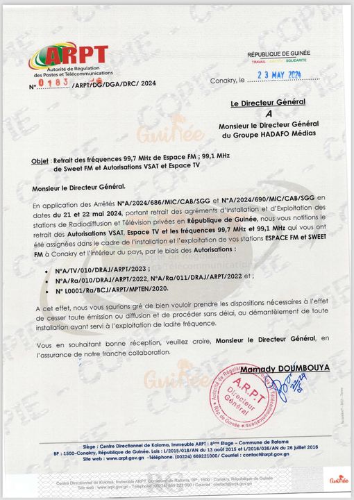 Guinée : Retrait des Licences, l’ARPT ‘’exige’’ le démantèlement sans délai de toutes installations des fréquences d’ESPACE FM, TV et SWEET (courrier) !!!