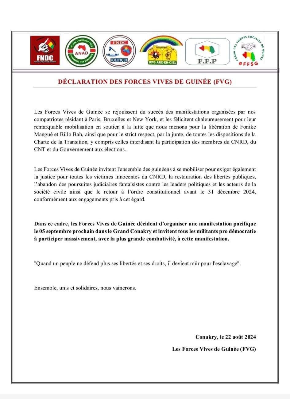 Dans ce cadre, les Forces Vives de Guinée décident d’organiser une manifestation pacifique le 05 septembre prochain dans le Grand Conakry et invitent tous les militants pro démocratie à participer massivement, avec la plus grande combativité, à cette manifestation.