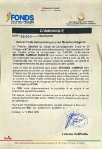 La Direction Générale du Fonds de Développement Social et de l’Indigence (FDSI) très honorée de cette démarche y adhère pleinement et porte à la connaissance de tous que cet événement humanitaire est prévu le 13 Avril 2024 à partir de 20h00, au Chapiteau By Issa.