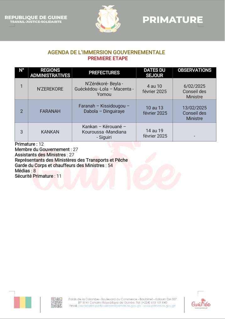 Le premier ministre chef du gouvernement, Amadou Oury Bah a dans une lettre en date du 31 janvier 2025, adressée au ministre de l’Administration du Territoire et de la Décentralisation, annoncé une immersion de son gouvernement à l’intérieur du pays. Cette immersion est prévue pour une durée d’un mois, et c’est la région administrative de N’Zérékoré, qui sera la première étape de ce périple.