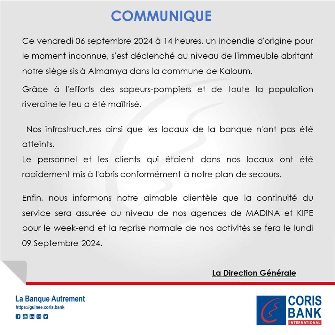 Comme nous l’annoncions dans un de nos articles, un incendie s’est déclaré ce vendredi, 06 septembre 2024, dans l’immeuble qui abrite la banque ‘’CORIS BANK’’ au quartier Almamamyah, commune de Kaloum.