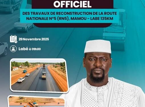 Conformément à la vision du 𝗣𝗿𝗲́𝘀𝗶𝗱𝗲𝗻𝘁 𝗱𝗲 𝗹𝗮 𝗥𝗲́𝗽𝘂𝗯𝗹𝗶𝗾𝘂𝗲 𝗠𝗮𝗺𝗮𝗱𝗶 𝗗𝗢𝗨𝗠𝗕𝗢𝗨𝗬𝗔, inscrite dans l’Axe 3 du programme 𝐒𝐈𝐌𝐀𝐍𝐃𝐎𝐔𝟐𝟎𝟒𝟎, et sous le 𝐇𝐚𝐮𝐭 𝐏𝐚𝐭𝐫𝐨𝐧𝐚𝐠𝐞 𝐝𝐞 𝐒𝐨𝐧 𝐄𝐱𝐜𝐞𝐥𝐥𝐞𝐧𝐜𝐞 𝐌𝐨𝐧𝐬𝐢𝐞𝐮𝐫 𝐥𝐞 𝐏𝐫𝐞𝐦𝐢𝐞𝐫 𝐌𝐢𝐧𝐢𝐬𝐭𝐫𝐞, 𝐂𝐡𝐞𝐟 𝐝𝐮 𝐆𝐨𝐮𝐯𝐞𝐫𝐧𝐞𝐦𝐞𝐧𝐭, le Ministère des Infrastructures et des Travaux Publics, à travers l’AGEROUTE Guinée SA, a l’honneur d’inviter l’ensemble des citoyens à la cérémonie officielle de lancement des travaux de reconstruction de la Route Nationale N°5 (RN5), reliant Mamou à Labé sur 135 km.