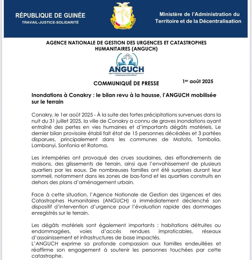 Dans un communiqué de l’Agence Nationale de Gestion des Urgences et catastrophes humanitaires (ANGUSCH) rendu public ce vendredi 1er août 2025, le bilan des inondations survenu dans la nuit du mercredi au jeudi 31 juillet 2025 à Conakry est de passé de sept (7) à quinze (15) morts.