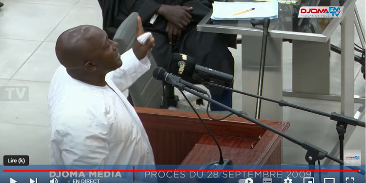 Le commandant Aboubacar Sidiki Diakité dit Toumba est à la barre pour la sixième fois ce mardi 1er novembre 2022 devant le tribunal criminel de Dixinn délocalisé à la Cour d’Appel de Conakry. Il est interrogé ce matin par Me Pépé Antoine Lamah. L’avocat de Dadis le confondu à ses propos. Lundi, l’accusé a révélé qu’il n’a pas été arrêté, mais plutôt qu’il s’est fait localiser à Dakar. Comme pour démentir ces propos, Me Pépé Antoine Lamah à travers leur procès-verbal, a rappelé que les enquêteurs Sénégalais l’ont filé avant de l’interpeller. Toumba maintient ses déclarations et ajoute qu’il a été arrêté après qu’il se soit fait localiser par l’entremise d’un de ses conseils du nom de Diawara. L’avocat est aussi revenu sur une des interventions de l’accusé sur Rfi, quand il a souhaité être gracié par le Général Sékouba Konaté après avoir reconnu s’être rendu au stade, mais sur l’ordre du président d’alors. En réponse, l’ancien aide de camp du capitaine Moussa Dadis Camara a déclaré qu’il a été piégé. Il n’était pas habitué à cet exercice, a-t-il étayé.