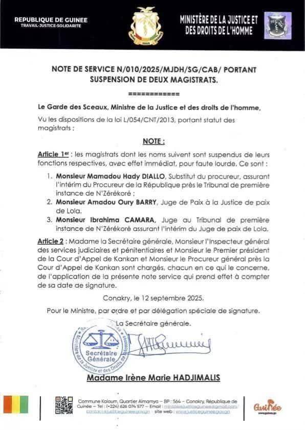 Selon nos informations auprès du ministère de la justice garde des sceaux et des droits de l’homme, trois (3) magistrats ont été suspendus le vendredi 12 septembre 2025 pour ‘’faute lourde’’ par le ministre Yaya Kairaba Kaba. Cela en vertu de la loi L/054/CNT/2013, portant statut des magistrats.