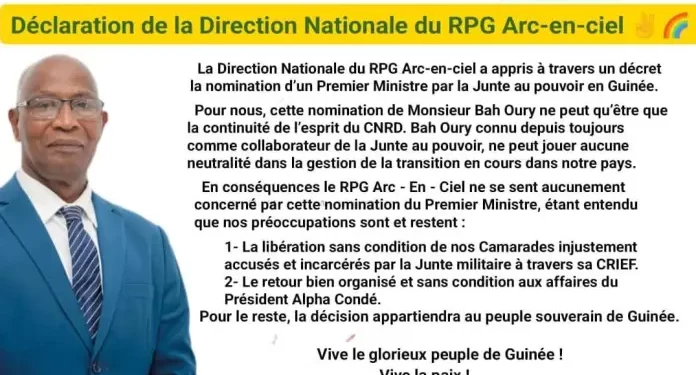 Déclaration de la Direction Nationale du RPG Arc-en-ciel : La Direction Nationale du RPG Arc-en-ciel a appris à travers un décret la nomination d’un Premier Ministre par la Junte au pouvoir en Guinée. Pour nous, cette nomination de Monsieur Bah Oury ne peut qu’être que la continuité de l’esprit du CNRD. Bah Oury connu depuis toujours comme collaborateur de la Junte au pouvoir, ne peut jouer aucune neutralité dans la gestion de la transition en cours dans notre pays.