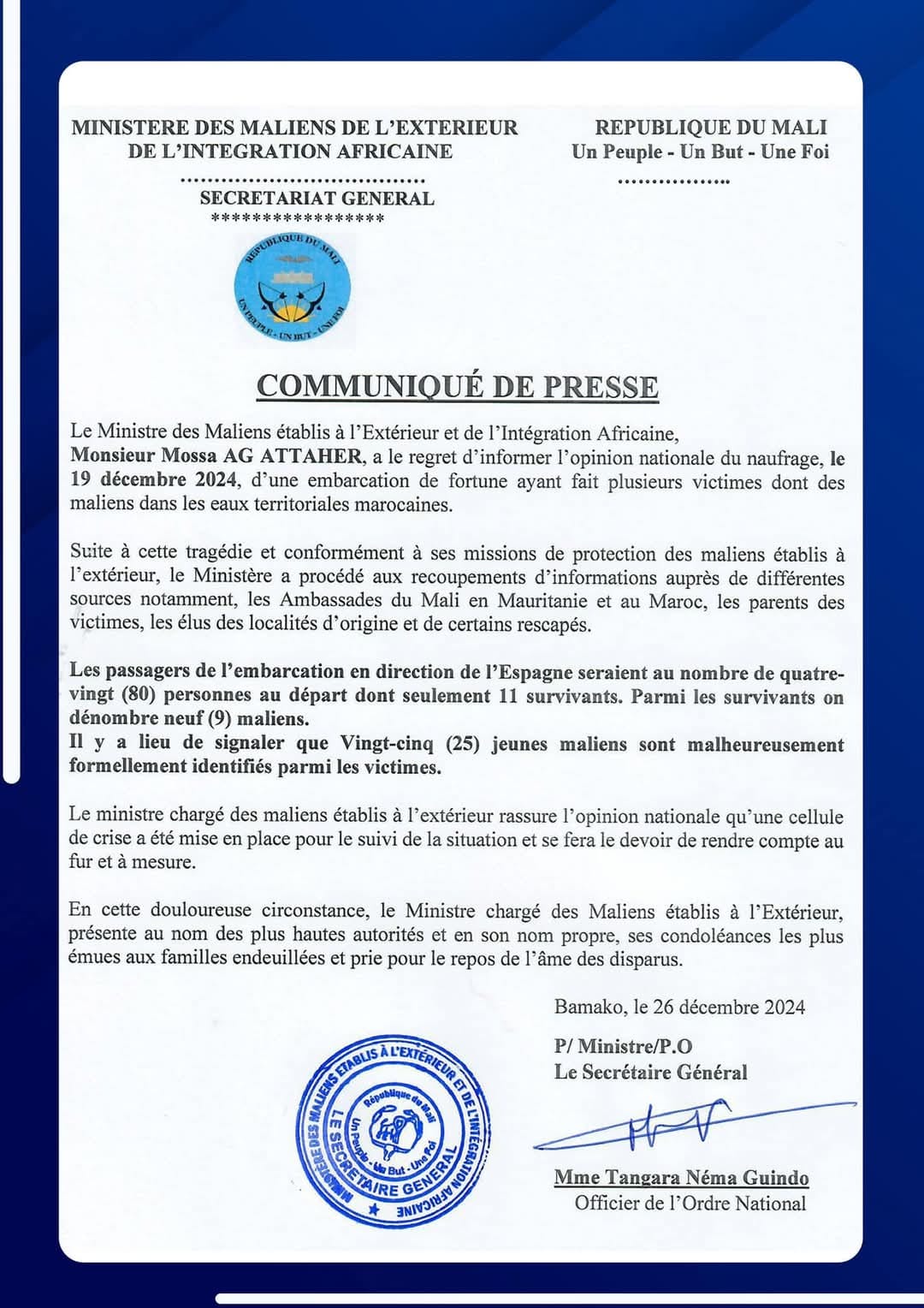« Un naufrage survenu le 19 décembre 2024 d’une embarcation de fortune a fait plusieurs victimes, dont des Maliens, dans les eaux territoriales marocaines », a indiqué le ministre des Maliens établis à l’extérieur et de l’intégration africaine, Mossa Ag Attaher, dans un communiqué en date du 26 décembre 2024.