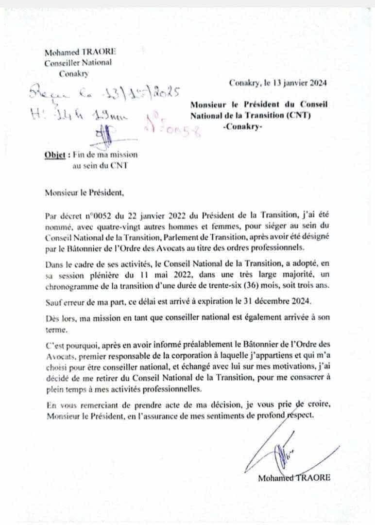 Maitre Mohamed Traoré, représentant du Barreau guinéen au Conseil national de la transition (CNT) a dans une lettre adressée au président de l’organe législatif, annoncé sa démission au sein de cette institution parlementaire.