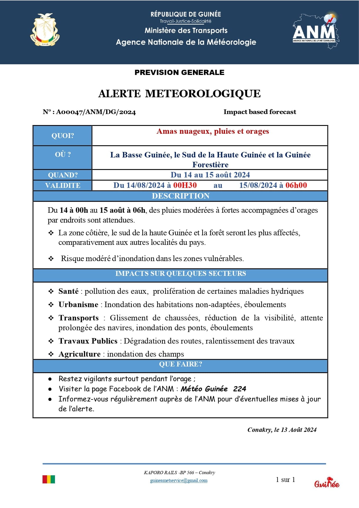 Ci-dessous le rapport de la Direction Nationale de Météorologie (ANM) en date du mardi, 13 Août 2024.
