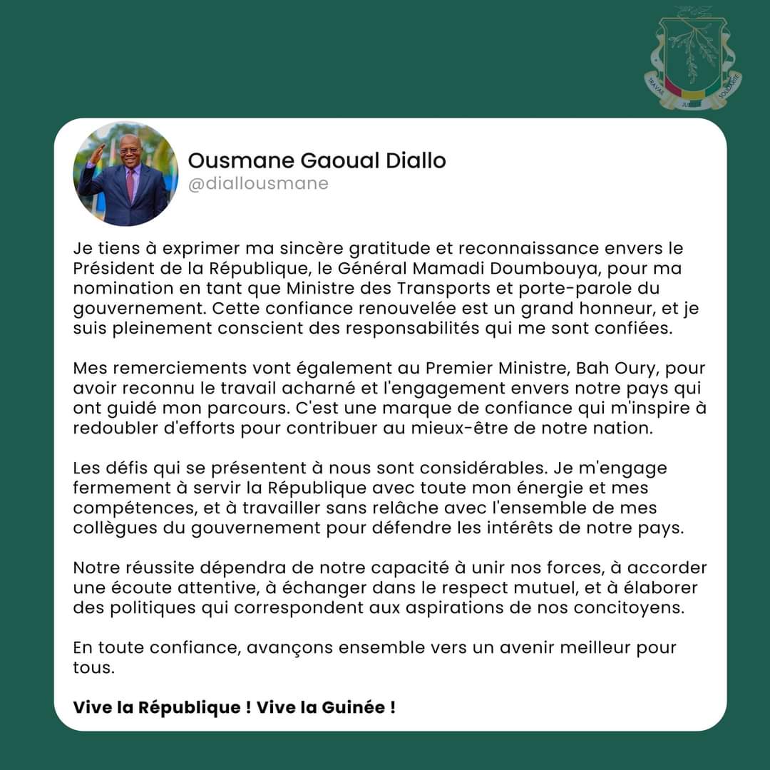 Depuis le début de la transition en Septembre 2021, le ministre Ousmane Gaoual a bénéficié de trois décrets, d’abord ministre de l’urbanisme et de l’habitat, puis ministre des Postes, des Telecommunications et de l’Economie numérique, voilà qu’il est nommé ministre des Transports, après la dissolution du gouvernement de Dr Bernard Goumou.