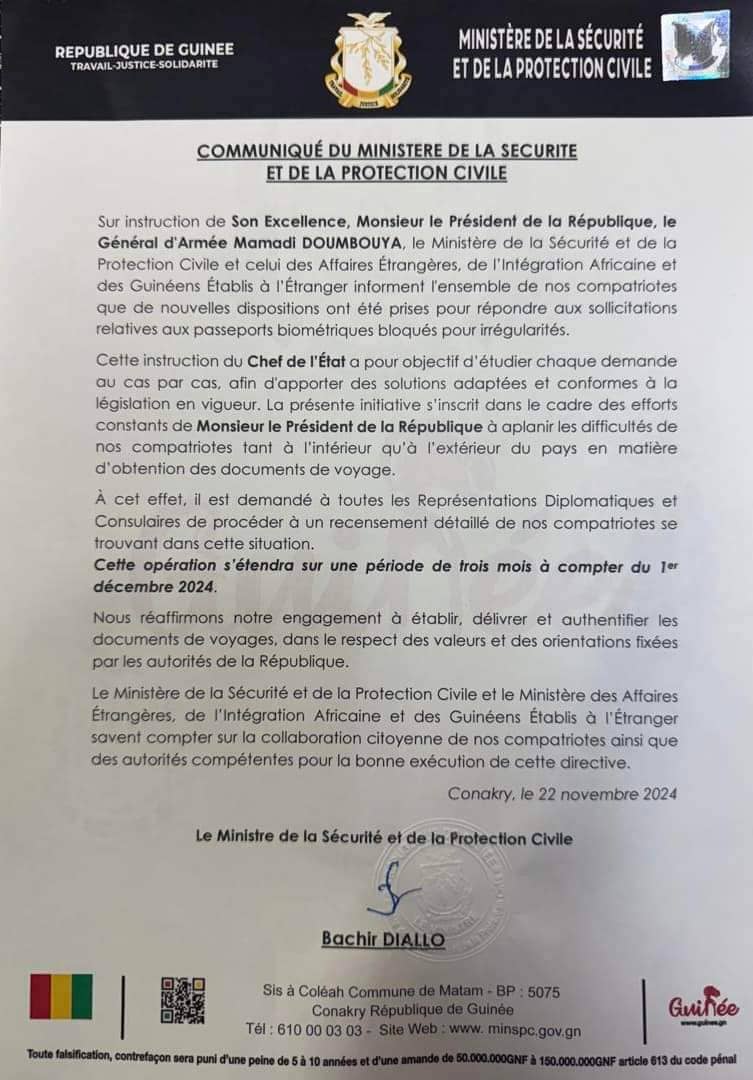 Le Ministère de la Sécurité et de la Protection Civile, en collaboration avec le Ministère des Affaires étrangères a à travers un communiqué annoncé le lancement d’une opération de recensement pour résoudre les problèmes liés aux passeports biométriques bloqués pour irrégularités. Cette initiative, qui débutera le 1er décembre 2024 pour une durée de trois mois, vise à offrir des solutions adaptées à chaque cas tout en respectant la législation en vigueur.