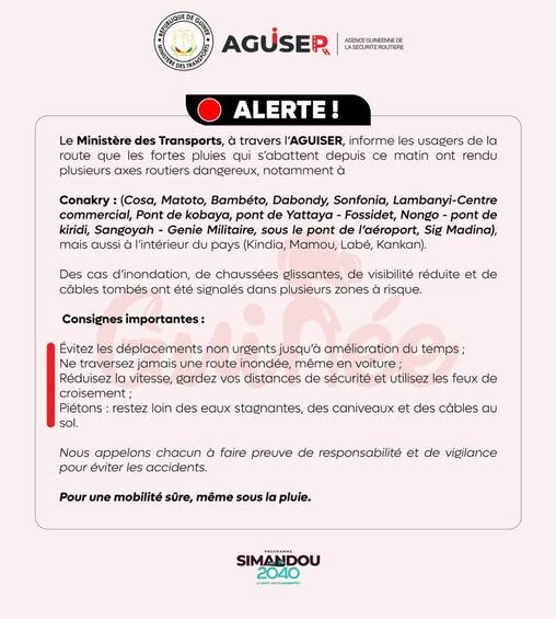 Pluies intenses à Conakry : L’Aguiser alerte sur la dangerosité de plusieurs axes routiers