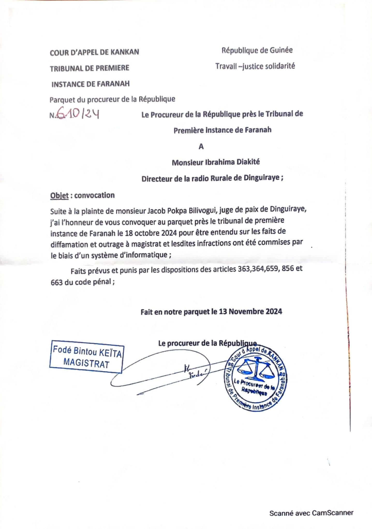 En effet, le Procureur de la République près du Tribunal de première instance de Faranah, Fodé Bintou Keita a dans une convocation N°610/24, en date de ce mercredi 13 novembre 2024, annoncé une convocation à l’endroit de Monsieur Ibrahima Diakité, directeur de la radio rurale de Dinguiraye. Une convocation qui « fait suite à la plainte de monsieur Jacob Pokba Billivogui, juge de paix de Dinguiraye pour des faits de diffamation et outrage à magistrat et lesdites infractions ont été commises par le biais d’un système d’informatique ».