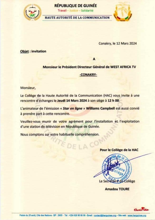 Mais une source du côté de la Haute Autorité de la Communication (HAC), organe chargé de réguler les médias en Guinée, nous apprend que cette institution a adressé une lettre d’invitation au PDG de la télévision ‘’WEST AFRICA TV’’ ainsi qu’à l’animateur de l’émission ‘’STAR EN LIGNE’’, Williams CAMPBELL. Ils doivent se présenter le jeudi 14 mars prochain. Donc, pour notre informateur, le PDG a vite anticipé la suspension de l’animateur, car l’ordre du jour sera sur ces manquements que commet souvent l’animateur de l’Emission ‘’STAR EN LIGNE’’ Williams ; de toutes les façons, ils sont attendus à la HAC le jeudi, a informé notre source.