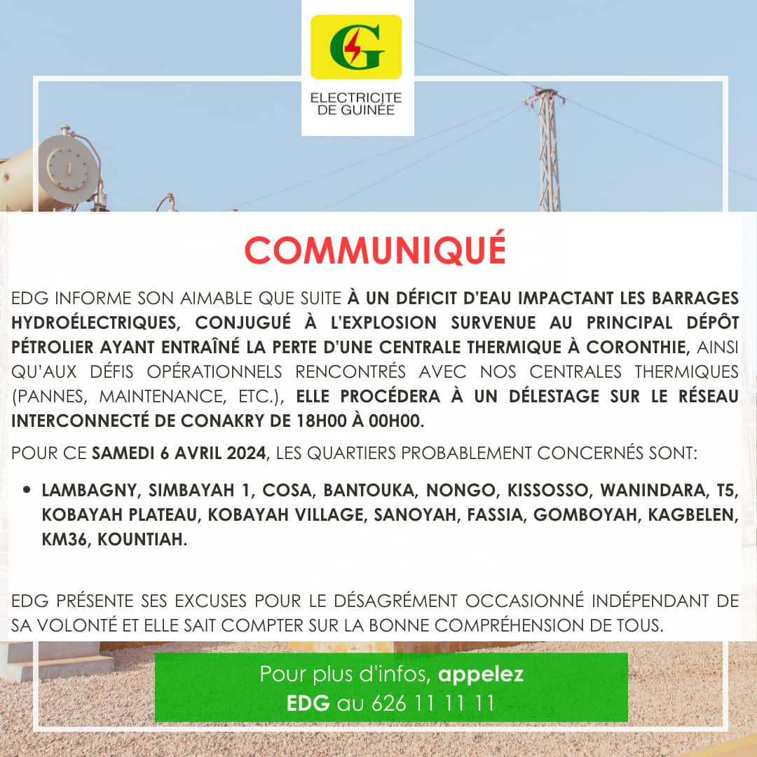 Programme de délestage : Voici les quartiers concernés pour ce samedi 6 avril (Communiqué)!!!