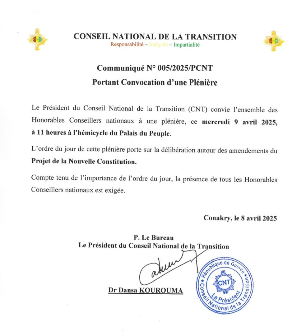 Le président du Conseil National de la Transition (CNT), Dr Dansa Kourouma a dans un communiqué N°005/2025/PCNT en date de ce mardi 8 avril 2025, convié l’ensemble des conseillers nationaux à une plénière ce mercredi 9 avril 2025, à l’Hémicycle du Palais du Peuple. La rencontre est prévue à 11 heures, et a pour ordre du jour, ‘’délibération autour des amendements du projet de la Nouvelle Constitution’’.