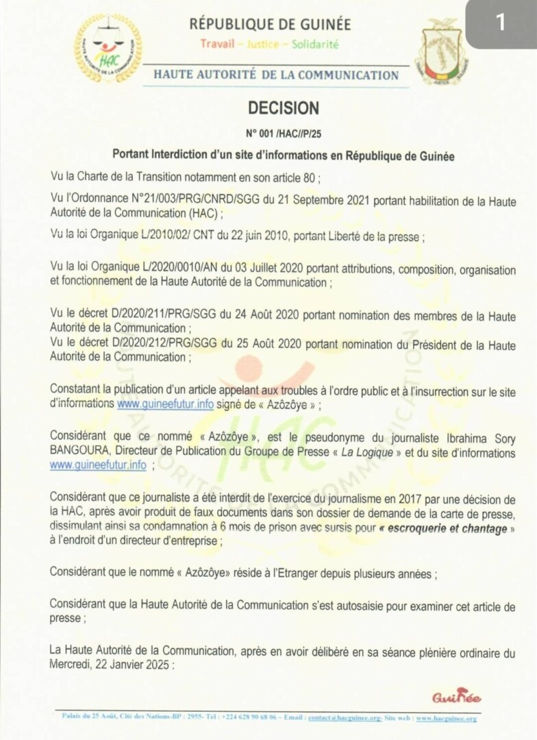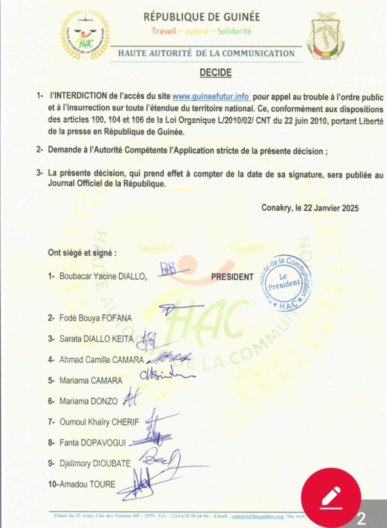 Publication d’un article appelant aux troubles et à l’ordre public en Guinée : la HAC interdit l’accès au site www.guineefutur.info (décision)