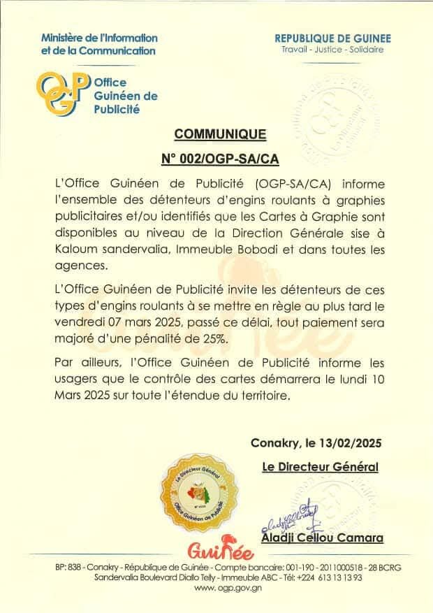 La Direction Générale de l’Office Guinéen de Publicité (OGP), avait à travers un communiqué N°002/OGP-SA/CA, en date du 13 février 2025, informé les détenteurs d’engins roulants à Graphie publicitaires et/ou identifiés que le contrôle des cartes démarrera le lundi 10 mars 2025. Et à partir de ce samedi, une pénalité de 25% qui s’applique sur le prix de chaque carte.