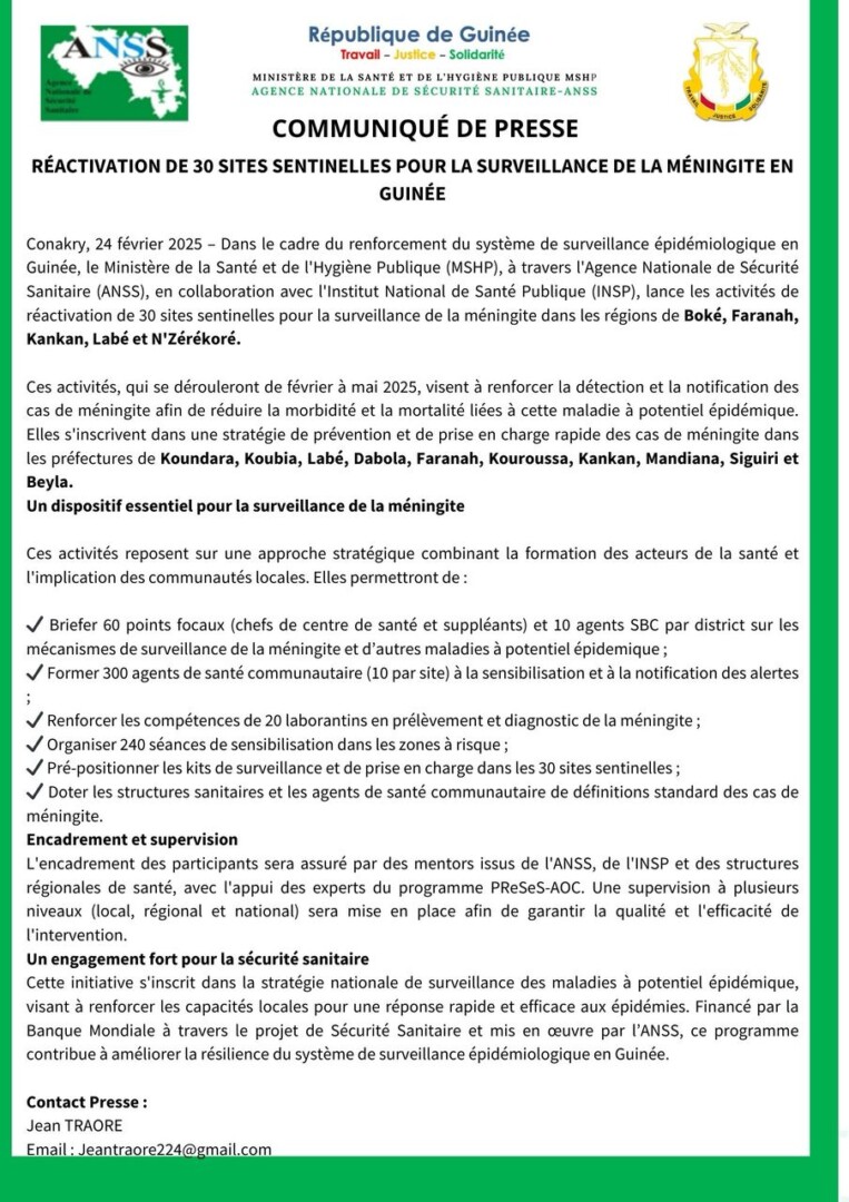 Conakry, 24 février 2025 – Face à la menace persistante de la méningite, la Guinée passe à l’offensive. Le Ministère de la Santé et de l’Hygiène Publique (MSHP), en collaboration avec l’Agence Nationale de Sécurité Sanitaire (ANSS) et l’Institut National de Santé Publique (INSP), a lancé la réactivation de 30 sites sentinelles à travers le pays pour renforcer la surveillance épidémiologique.