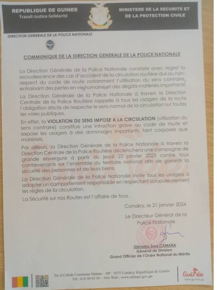 Face à la recrudescence des cas d’accidents dus au non respect du code de la route, notamment l’utilisation du sens contraire. La Direction générale de la police nationale annonce une campagne de grande envergure dès le jeudi 23 janvier prochain. C’est la Capitaine Rama Baldé, Porte-parole de la DGPN qui a lu le communiqué: