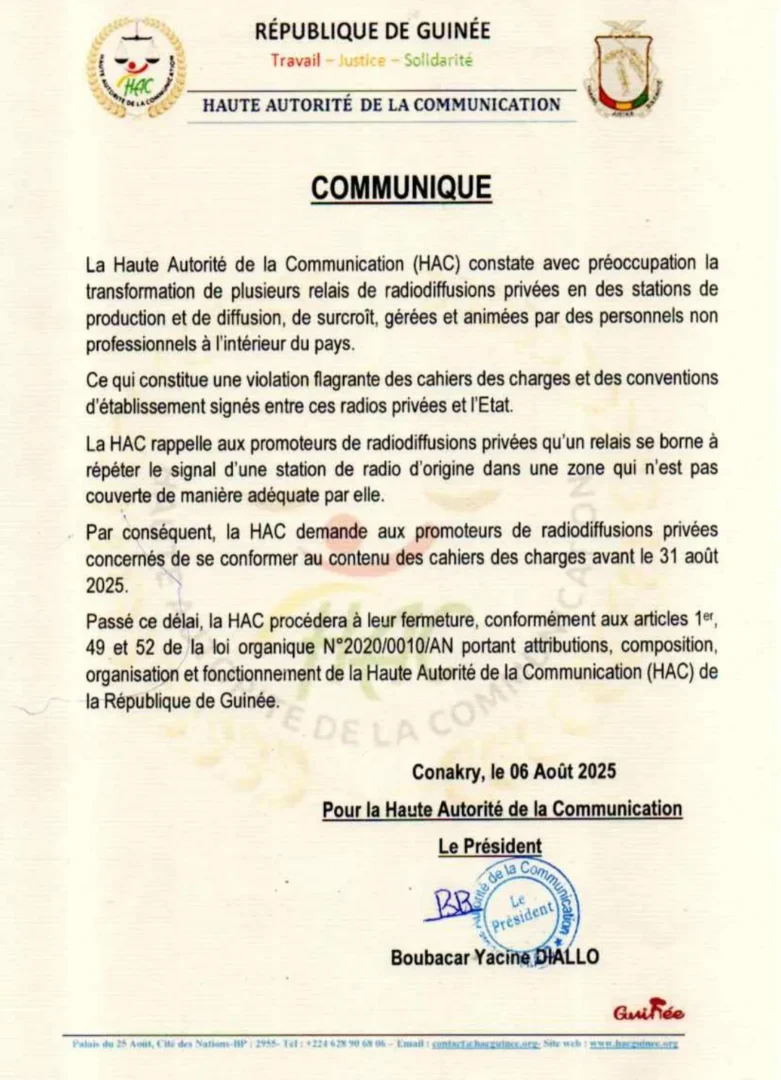 Relais de radios privées : La HAC dit constater encore une autre ‘’violation flagrante’’ (Communiqué)