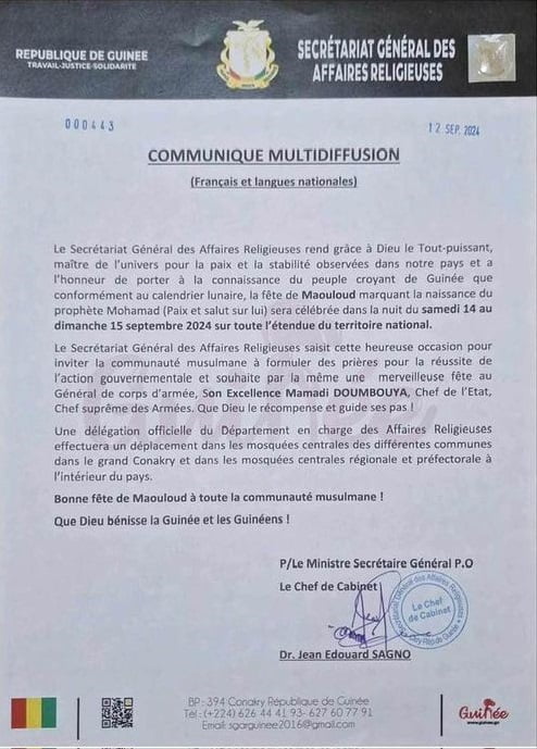 Le Secrétariat Général des Affaires Religieuses, a dans un communiqué multidiffusion N°000443, en date du 12 septembre, dit ‘’porter à la connaissance du peuple croyant de Guinée, que conformément au calendrier lunaire, la fête de Maouloud marquant la naissance du prophète Mouhamad (paix et salut sur lui) sera célébrée dans la nuit du samedi 14 au dimanche 15 septembre 2024 sur toute l’étendue du territoire national.