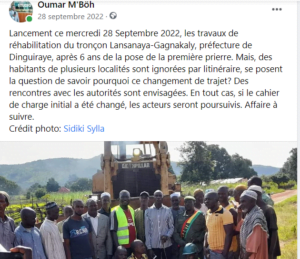 C’est en 2017 que l’ancienne ministre des Travaux Publics, madame Oumou Camara avait procéder à la pose de la première pierre de la réhabilitation de la route Dinguiraye-Lansanaya-Gagnakaly. Après 7 ans, les travaux ont été lancés le mercredi 28 Septembre 2022.