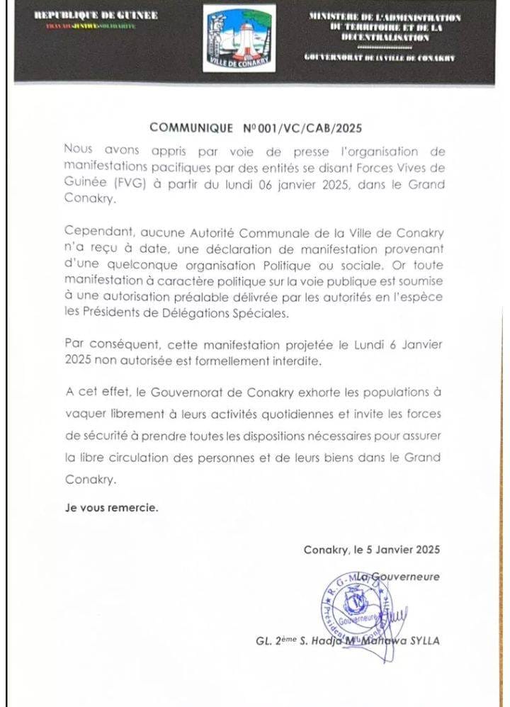 Dans un communiqué publié le dimanche, 05 janvier 2025, la gouverneure de la ville de Conakry, Générale Mahawa Sylla indique qu’aucune autorité communale de la ville n’a reçu une déclaration de manifestation provenant d’une quelconque organisation politique ou sociale. Or toute manifestation à caractère politique sur la voie publique est soumise à une autorisation préalable délivrée par les autorités en l’espace les présidents des délégations spéciales mentionne le communiqué.