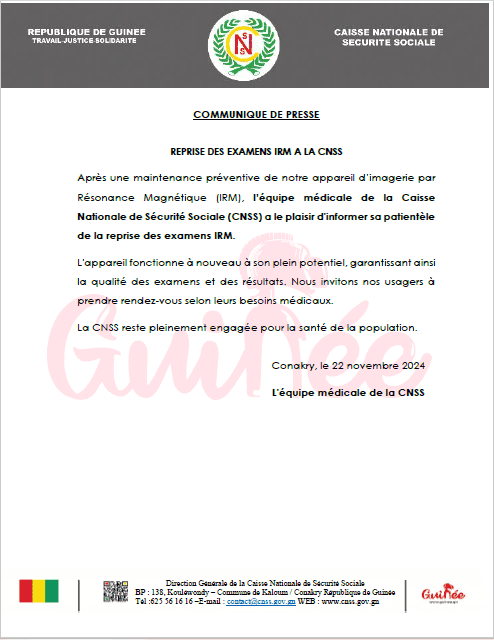 Après une maintenance préventive de notre appareil d’imagerie par Résonance Magnétique (IRM), l’équipe médicale de la Caisse Nationale de Sécurité Sociale (CNSS) a le plaisir d’informer sa patientèle de la reprise des examens IRM. L’appareil fonctionne à nouveau à son plein potentiel, garantissant ainsi la qualité des examens et des résultats. Nous invitons nos usagers à prendre rendez-vous selon leurs besoins médicaux.