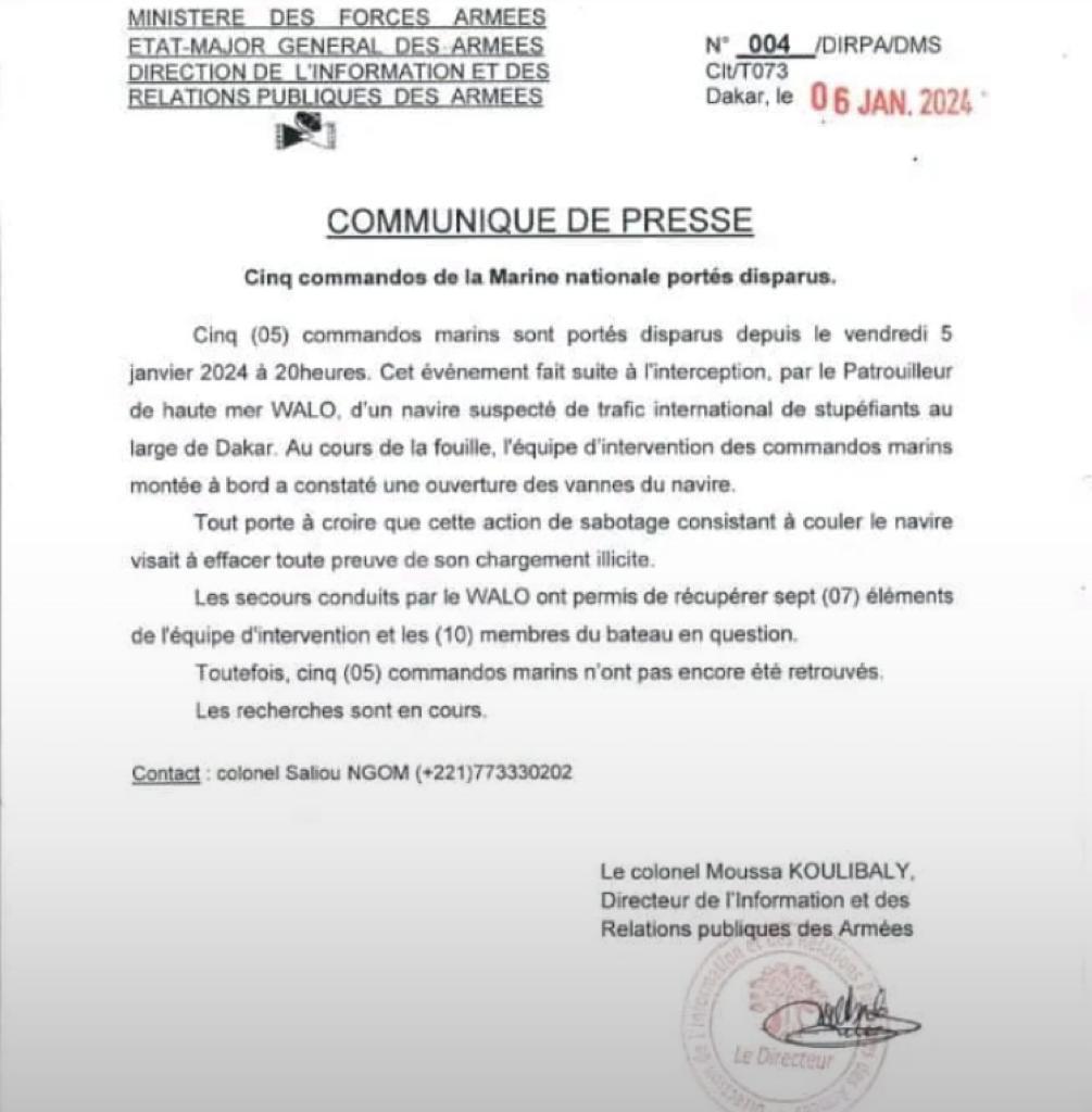 Sénégal : 5 Commandos de la Marine nationale portés disparus (Communiqué des forces armées)!!!
