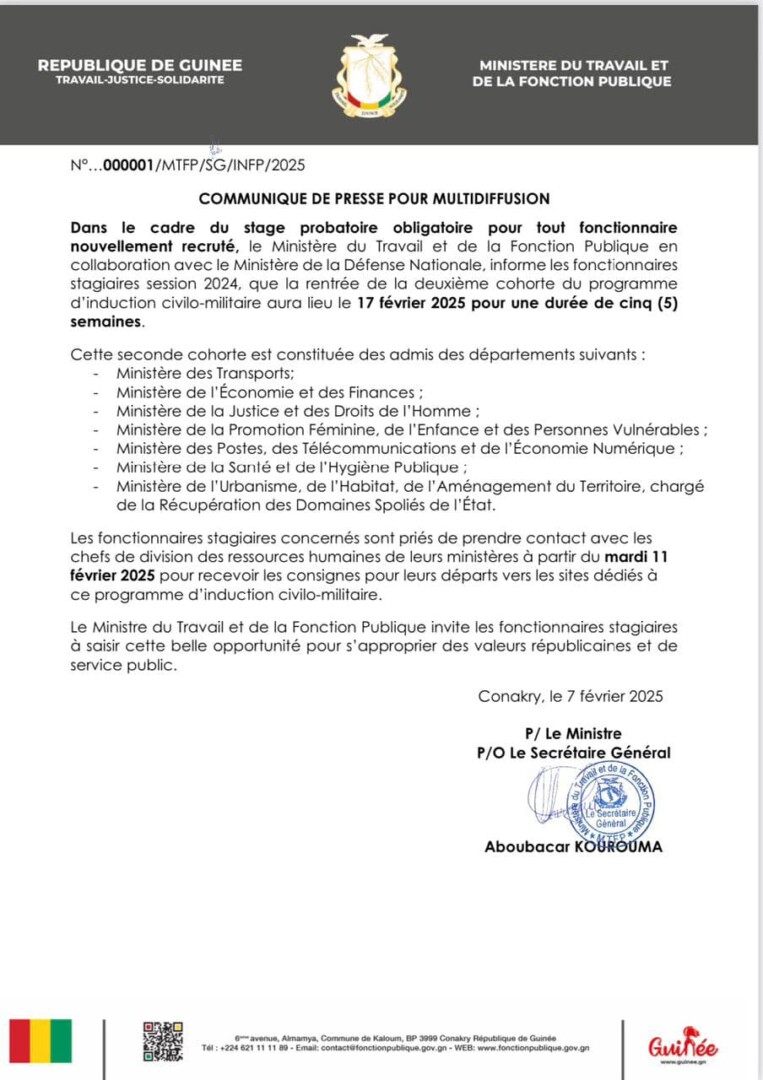 Stage probatoire obligatoire des nouveaux fonctionnaires : La 2ème annoncée pour le 17 février prochain (Communiqué)