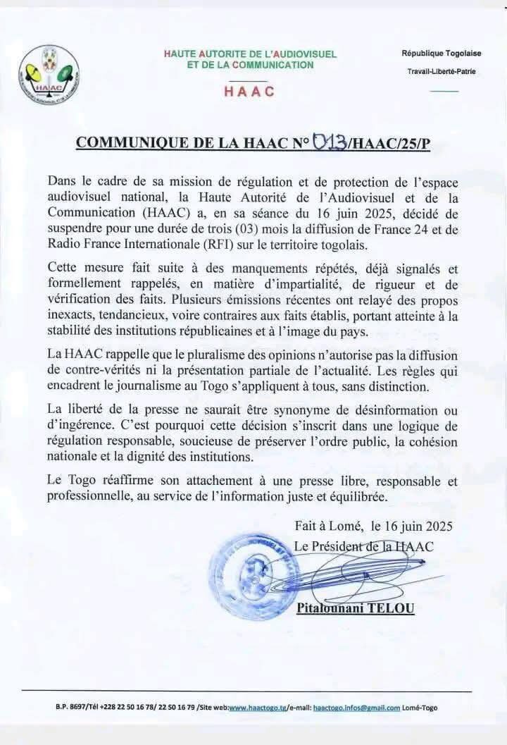Togo : ‘’Manquements répétés’’, la HAAC suspend France 24 et Rfi (Communiqué)