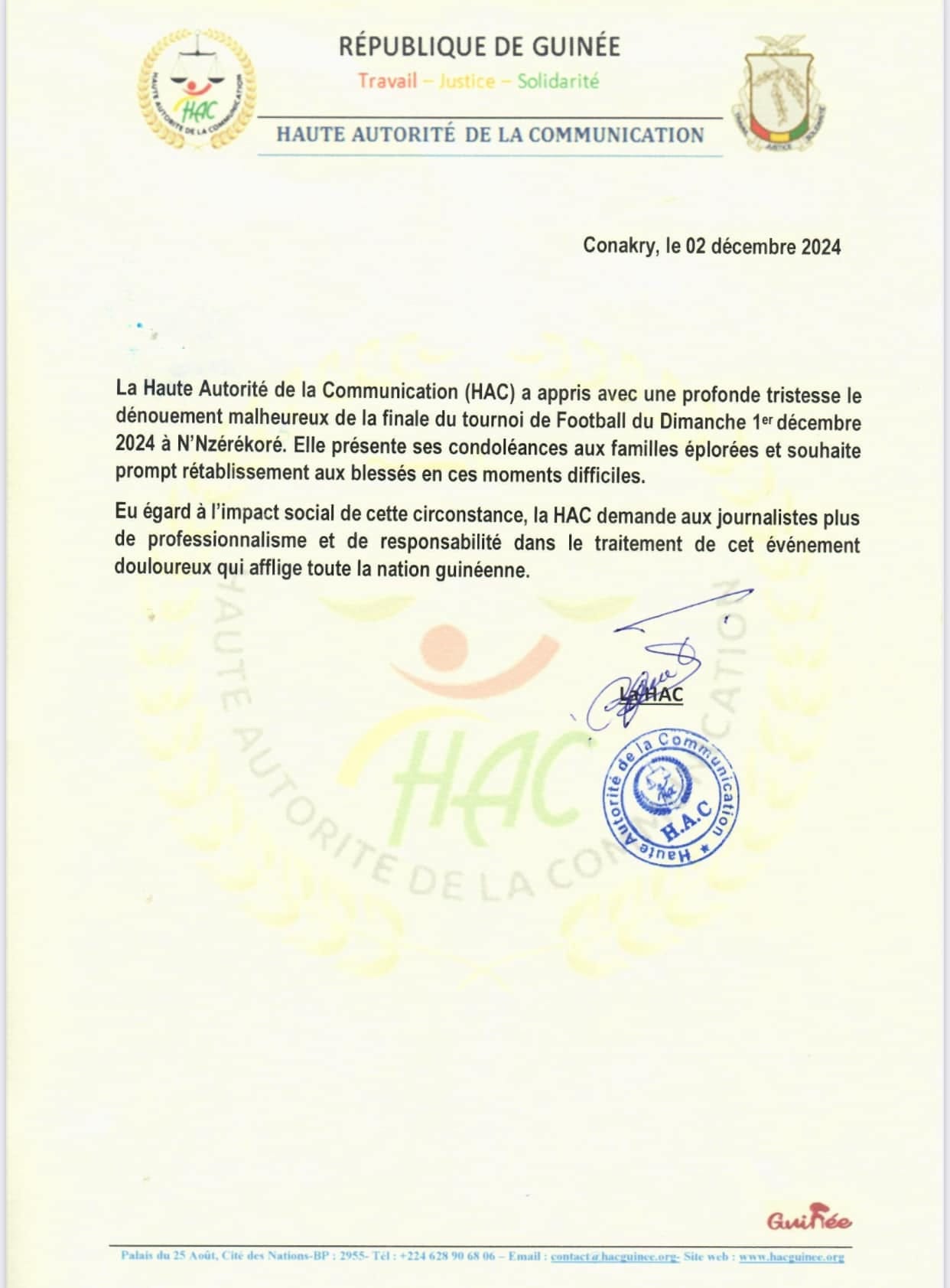 Un événement malheureux a été enregistré dimanche dernier au stade de N’Zérékoré. A cette occasion, la Haute Autorité de la Communication (HAC) a dans un communiqué rendu public le lundi, 02 décembre 2024, présenté ses condoléances aux familles éplorées avant d’inviter les journalistes à un traitement de façon responsable cette actualité.