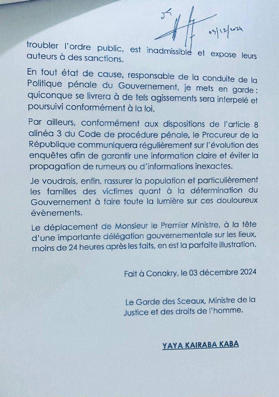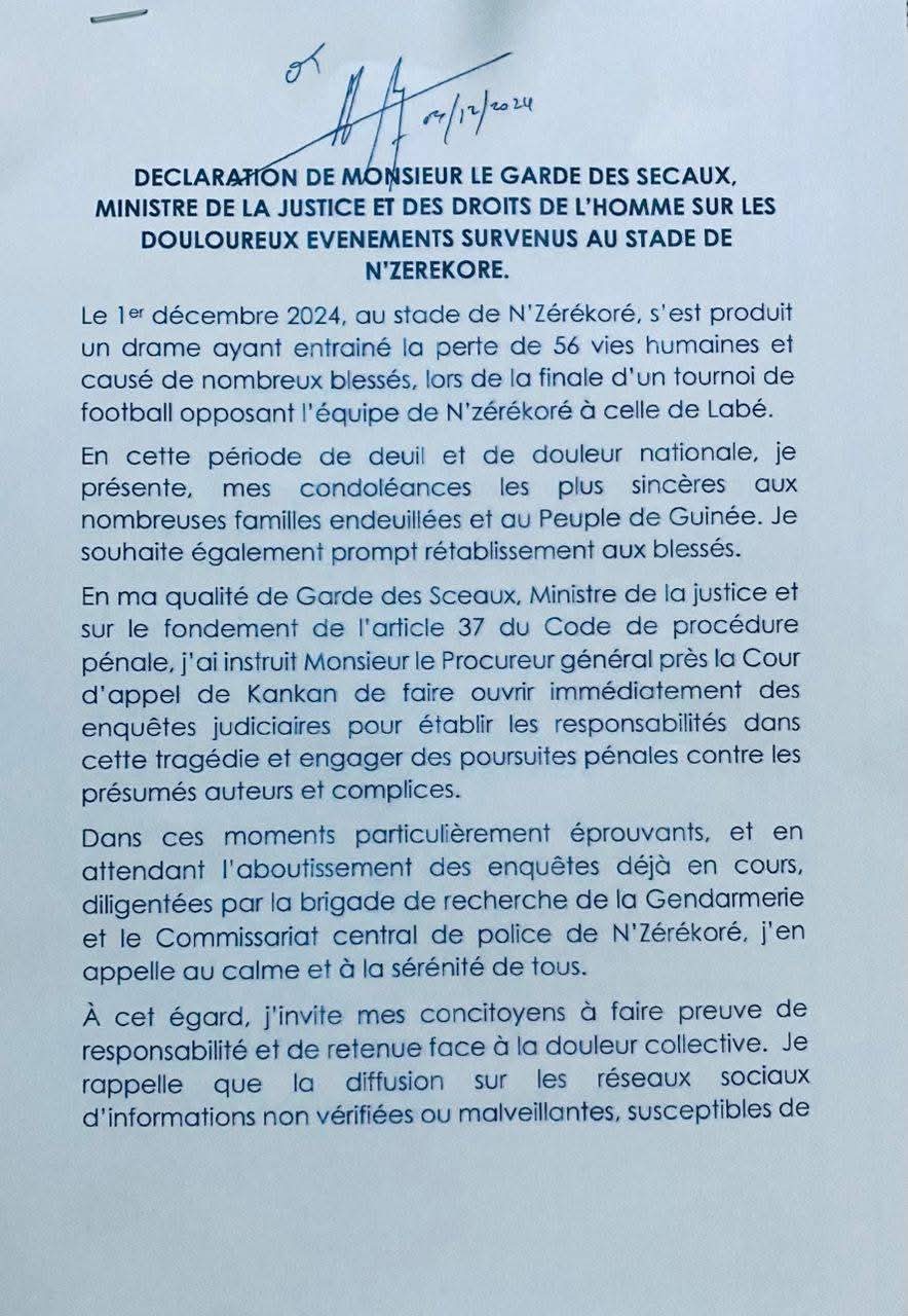 Tragédie à N’Zérékoré: Le Ministre de la Justice met en garde et rassure les populations (Déclaration)