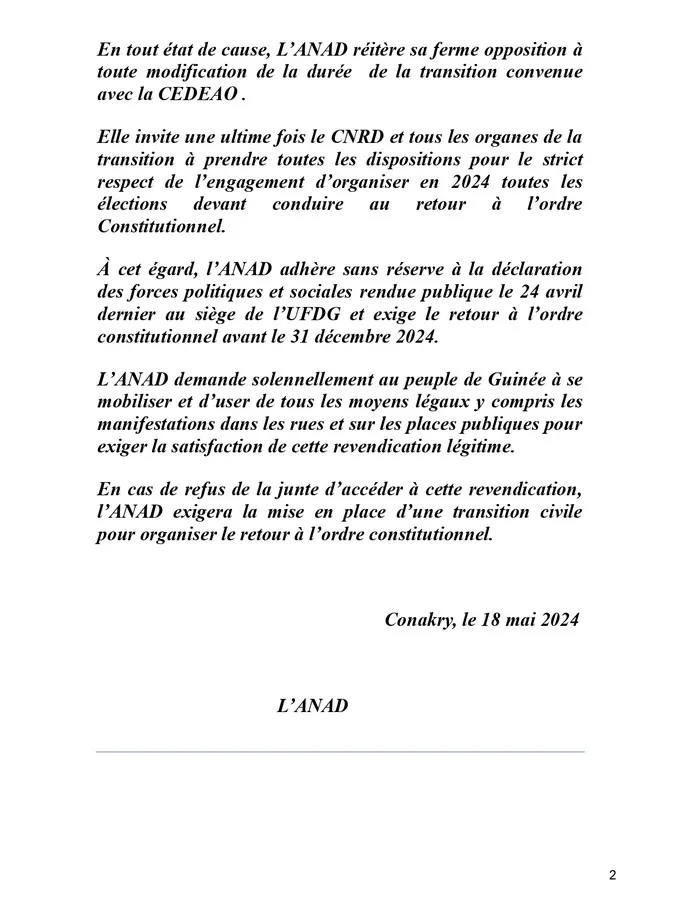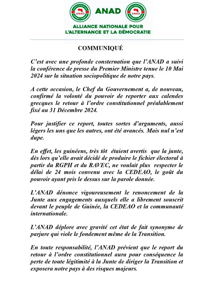 Transition en Guinée : L’ANAD accuse le CNRD de ‘’parjure’’ et menace (Déclaration) !!!