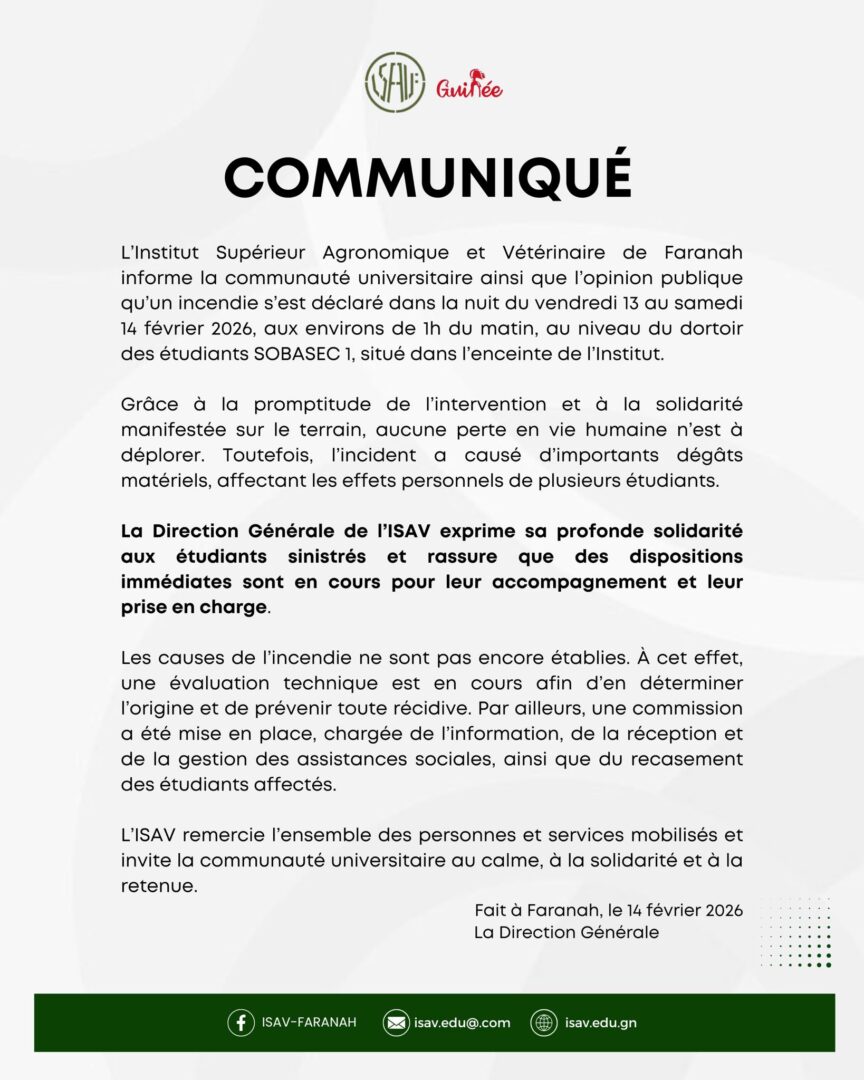 Faranah, 14 février 2026 – La communauté universitaire de l’Institut Supérieur Agronomique et Vétérinaire de Faranah (ISAV) a été secouée dans la nuit du vendredi 13 au samedi 14 février par un incendie survenu aux alentours de 1h du matin. Le sinistre a touché le dortoir des étudiants de la section SOBASEC 1, situé à l’intérieur de l’enceinte de l’Institut.