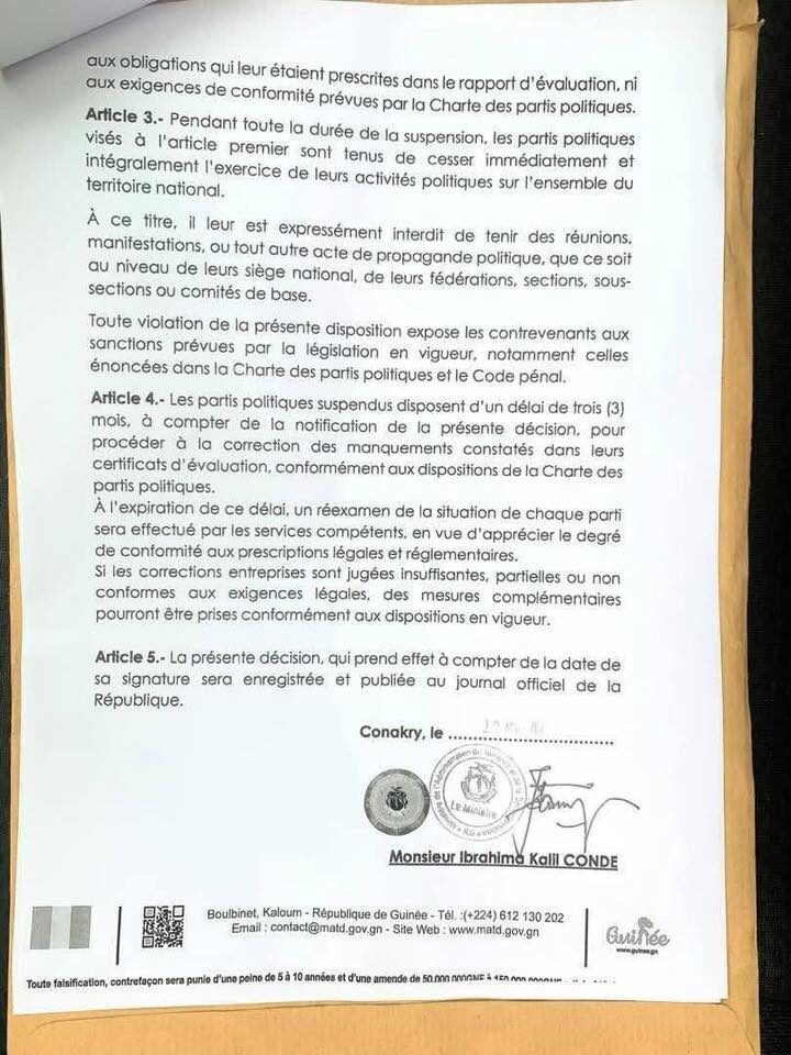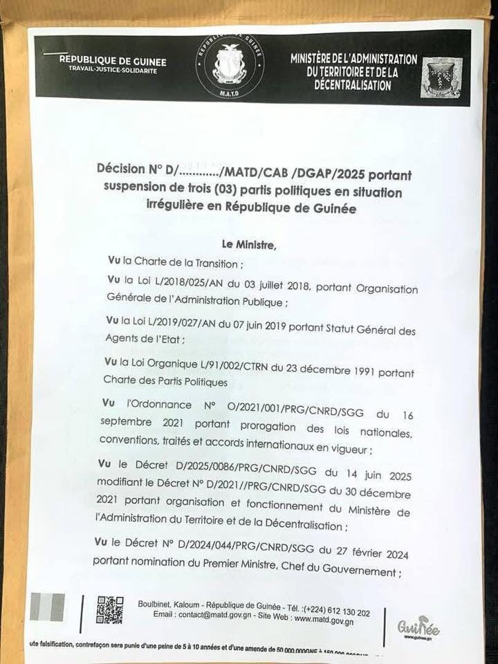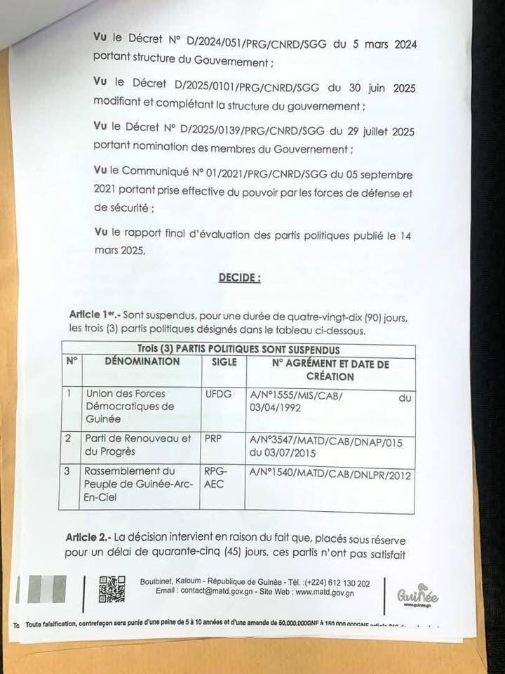 Urgent : L’UFDG, le RPG arc-en-ciel et le PRP suspendus par le MATD (