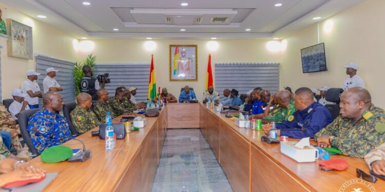 À l’issue de la journée électorale, plusieurs hauts responsables de l’État se sont réunis ce dimanche 21 septembre 2025 au Poste de Commandement Opérationnel de Sécurité Intérieure (PCO-SI) pour dresser le bilan sécuritaire du scrutin référendaire. Une rencontre placée sous la conduite du Premier Ministre, Chef du Gouvernement Amadou Oury BAH. Autour de la table : Le Ministre Secrétaire Général de la Présidence, le Général Amara CAMARA, le Ministre Directeur de Cabinet de la Présidence, Djiba DIAKITÉ, le ministre de la Justice et des Droits de l’Homme, Yaya Kairaba KABA, le ministre de l’Administration du Territoire et de la Décentralisation, Ibrahima Kalil CONDÉ, le haut commandant de la gendarmerie et Directeur de la justice militaire, le Premier président de la Cour suprême, Mohamed Lamine BANGOURA, la directrice générale des élections, Djenabou TOURÉ, et des membres du Comité National du Rassemblement pour le Développement (CNRD).