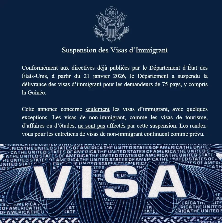 Conformément aux directives déjà publiées par le Département d’État des États-Unis, à partir du 21 janvier 2026, le Département a suspendu la délivrance des visas d’immigrant pour les demandeurs de 75 pays, y compris la Guinée.